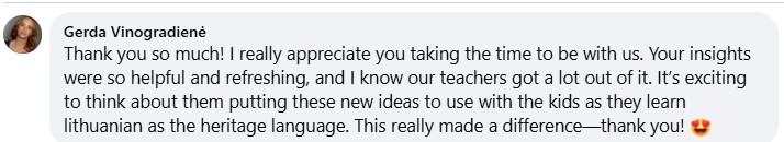The families requesting these services are located all over the world and the teachers are trained in different areas of expertise in Lithuania. These different areas of expertise are necessary when you teach learners online from the age of 2. My talk inspired a multicultural approach incoporating the learners' different cultural contexts in the online classes to reach the common goal of learning Lithuanian.